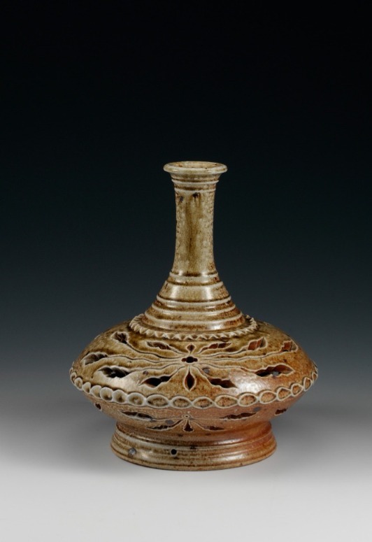鏤空菊紋長景瓶是由四個拉坯器型組合而成,並搭配林添福最擅長的鏤空菊紋裝飾。作品在柴燒過程中,因為火焰的流動與陰陽面的影響,產生了受火面與背火面的自然色澤對比。高溫燒製讓器型微微產生變形,形成自然的收縮律動感,柴燒中極具魅力的偶然之美。