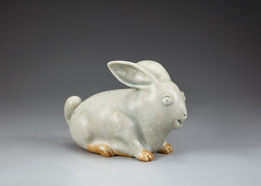 白玉兔 白玉兔是林添福在86歲時創作的作品,曾於國立歷史博物館展出。當年因應兔年,他以手捏法,捏製了第一隻兔子後自覺得非常滿意,改用拉坯製作身體,手捏法加以改造,又做了10隻兔子,成為當年展覽的重要展品之一。這隻白玉兔外層淋了一層白瓷土長石釉,經過自然高溫柴燒燒製後,釉面呈現自然如雨過天青般溫潤的青玉質感,呈現出典雅而柔和的色澤。 白玉兔是林添福晚年創作中的一大亮點,其質地溫潤、氣質典雅,展現了他深厚的陶藝內蘊。與白玉兔同一個系列的作品,還有黃金兔、立兔等作品,呈現出不同風味的自然柴燒美感。 語音導覽-白玉兔
