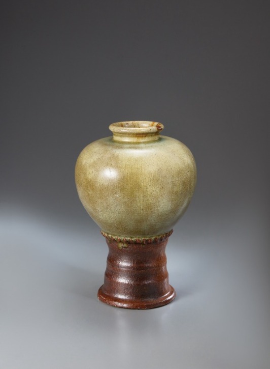 〈青玉福氣瓶〉的造型極為簡潔,器身為傳統甕形,底部嫁接高台構成直立高足,比例勻稱優雅。此系列作品靈感源自林添福晚年的個人形象──圓潤的光頭被親友戲稱為「大頭大福氣」,他便以自身為喻,幽默地將作品命名為「福氣瓶」。
