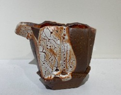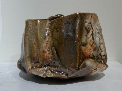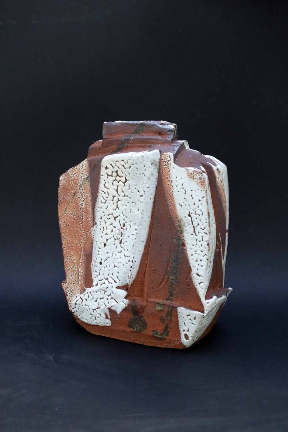 接著將作品挖空以形成內部空間,再用含鐵的泥漿裝飾,施以志野風格的釉藥,並在柴窯中以15至18小時燒成。