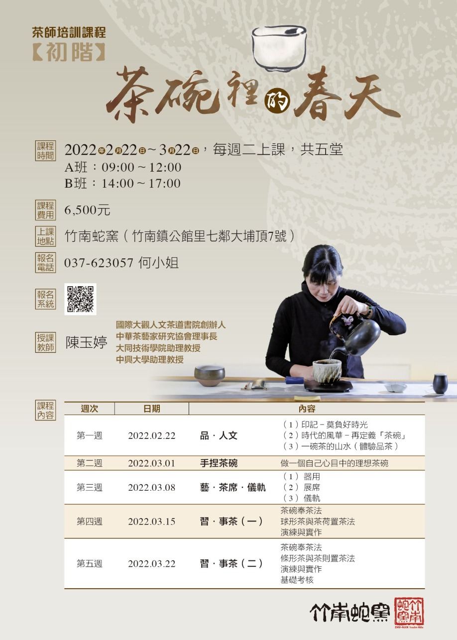 臺灣茶碗茶席課程,由國際大觀人文茶道書院「陳玉婷」老師授課,帶領你從品茶到事茶,從溫置注奉的儀軌中,學習茶碗的器用與茶席美學。以「一即一切」為核心精神,結合花藝、音樂、工藝、書畫等各種媒材,將臺灣當代的工藝與藝術形式,以一種最自信也最自在的方式,展現在臺灣茶碗茶席之上。