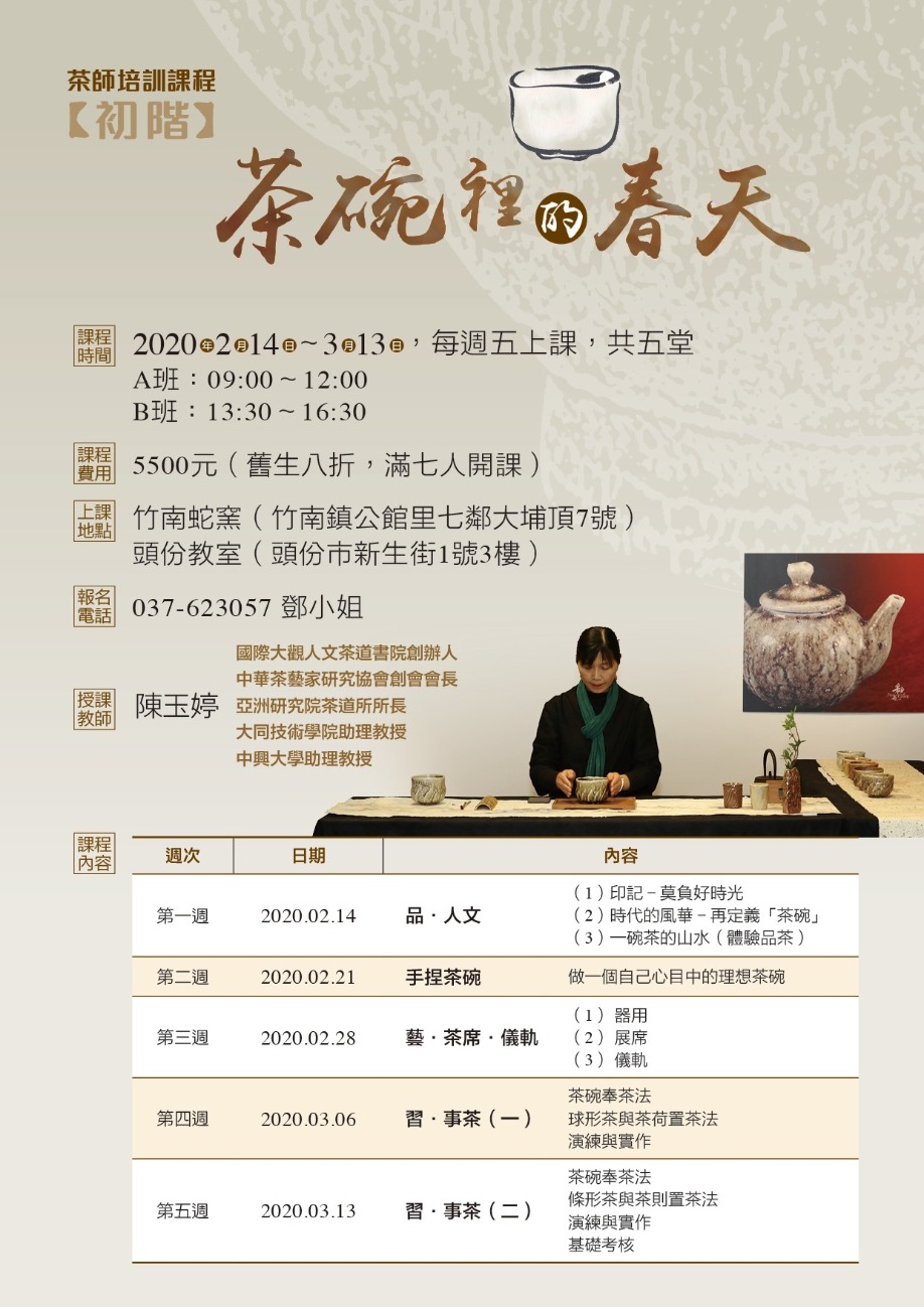 台灣茶碗茶席課程,由國際大觀人文茶道書院「陳玉婷」老師授課,帶領你從品茶到事茶,從溫置注奉的儀軌中,學習茶碗的器用與茶席美學。以「一即一切」為核心精神,結合花藝、音樂、工藝、書畫等各種媒材,將台灣當代的工藝與藝術形式,以一種最自信也最自在的方式,展現在台灣茶碗茶席之上。